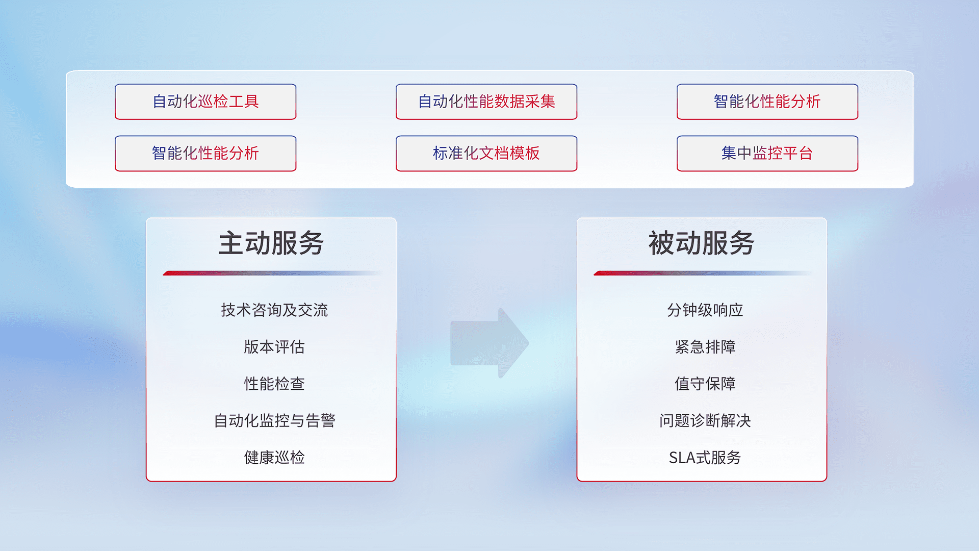 智能化工具和标准化文档,,保障服务质量,,提供主动服务(包含技术咨询、、、版本评估、、性能检查、、、、自动化监控与告警、、、、健康巡检)和被动服务包含(分钟级响应、、、紧急排障、、、值守保障、、、、问题诊断解决、、SLA服务)。。